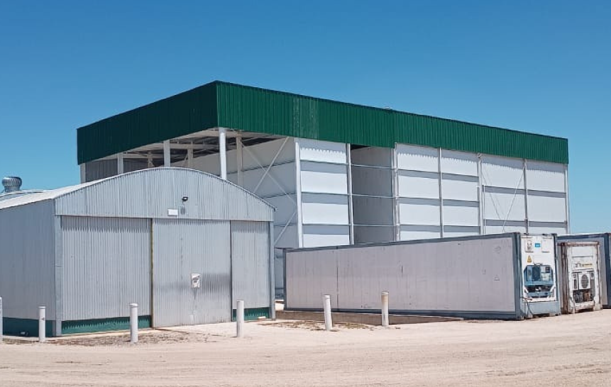 Fundación profunda con pilotes y cabezales, pisos con alisado mecánico, fabricación y montaje de estructura metálica con cerramiento de paneles PIR para cámara de frío.